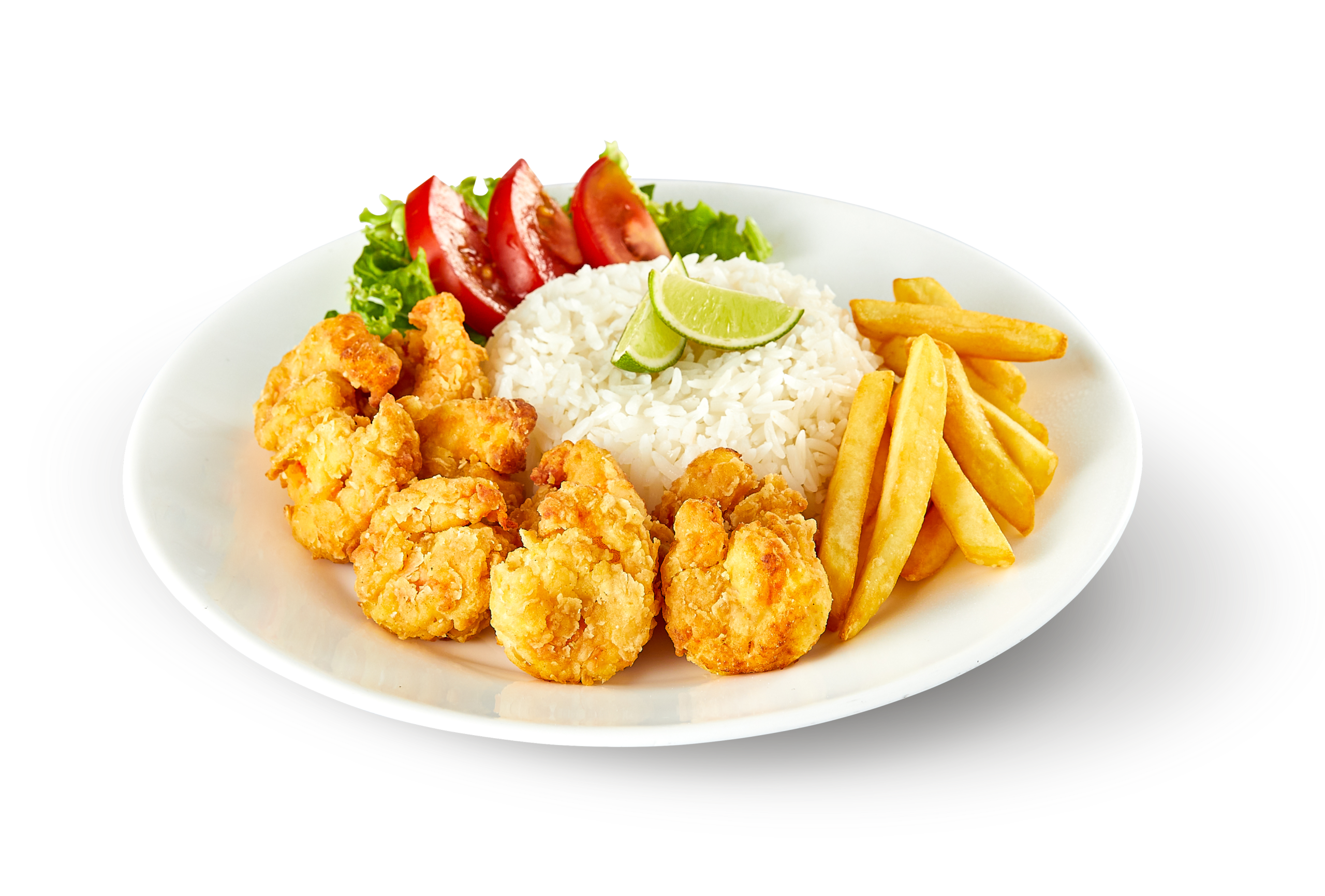 Camarones apanados, arroz y ensalada. Incluye bebida