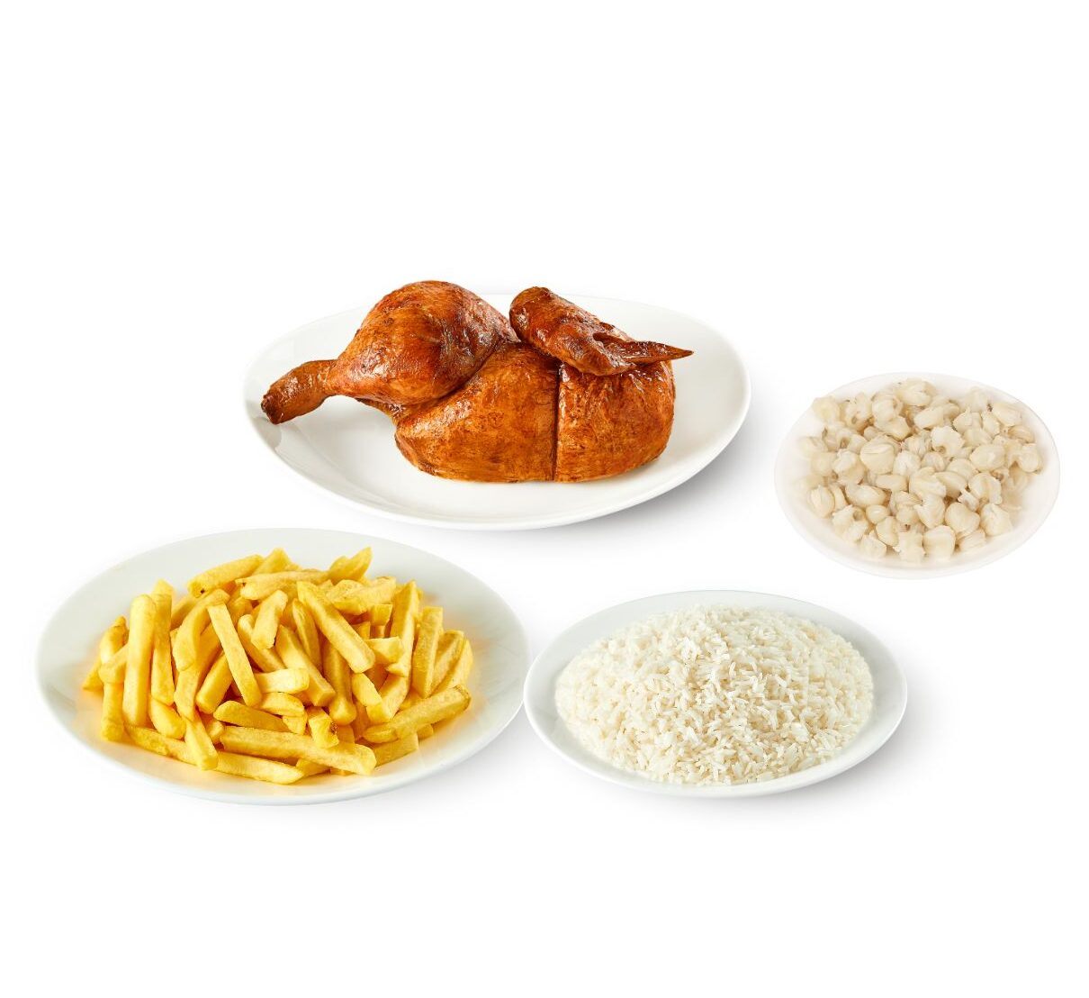 1/2 pollo asado, papas fritas, arroz, mote, ají, mayonesa.